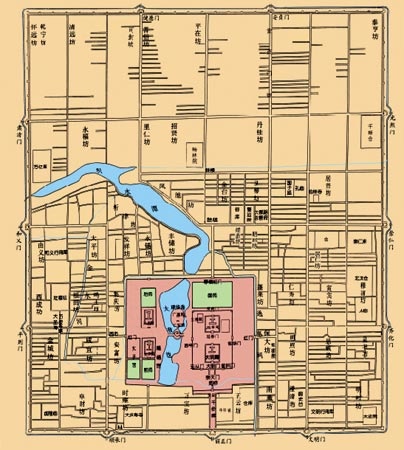 我們僅以唐朝的都城長安城為例。長安城的佈局是棋盤式的,整齊劃一,坊是居民區,市是商業區,互不干涉。白居易曾寫詩描寫長安城“百千家似圍棋局,十二街如種菜畦”,它形像地概括了這座都城的格局。