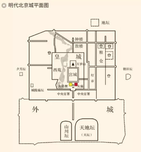 第二,“左祖右社,前朝後市”。“左祖右社”是指皇城的左邊是太廟,是帝王們祭祀祖先之處。在歷代都城裡,宗廟在所有的廟裡佔最重要的地位和最主要的位置。因為沒有祖先就沒有我們自己,因此,中國傳統觀念對宗廟的祭祀非常重視。皇城的右邊是社稷壇,即帝王們祭祀土地和五穀之神的地方。