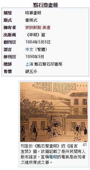 創刊於光緒十年(1884年)的《點石齋畫報》,在當時的石印畫報中最為出名。它由英國人美查(Ernest Major)創辦,每月出版3期,每期8頁,12期為一輯,隨《申報》附送。