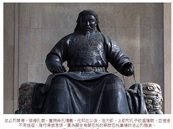 忽必烈尊儒,修繕孔廟,重振祭孔禮義。他即位以後,在大都、上都和孔子故里建廟,並通過不同途徑,推行儒家思想。圖為蒙古烏蘭巴托的蘇赫巴托廣場的忽必烈雕像。(Chinneeb/Wikimedia Commons)