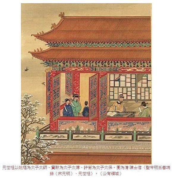 元世祖以姚樞為太子太師、竇默為太子太傅、許衡為太子太保。圖為清 陳士倌《聖帝明王善端錄(宋元明).元世祖》。(公有領域)