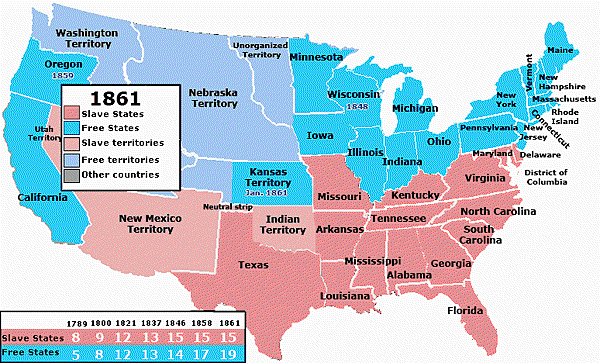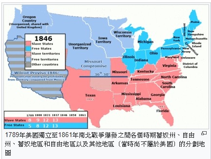 1789年美國獨立至1861年南北戰爭爆發之間各個時期蓄奴州、自由州、蓄奴地區和自由地區以及其他地區(當時尚不屬於美國)的分劃地圖