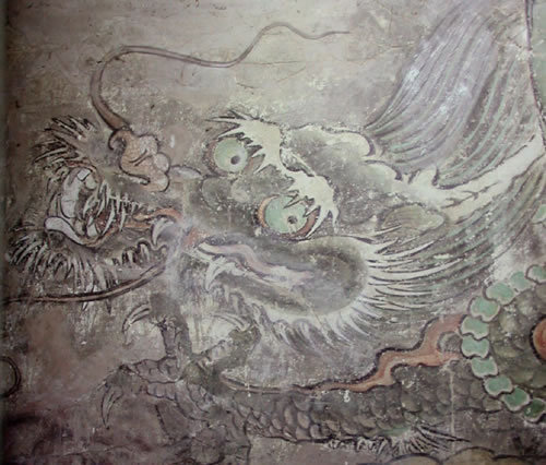 龍虎殿又稱無極門,原來是永樂宮的大門。殿的台基高聳,殿身面寬五間、進深六椽,內部梁架簡潔,殿內的壁畫所繪的神荼、鬱壘、神將、神吏、城隍、土地等二十六個守衛仙界的天神,手持各種兵器,鎧甲莊重森嚴,顯得威風凜凜,雖然壁畫略有殘損,但元作的氣魄仍然存在。