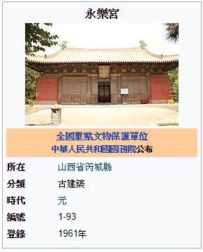 永樂宮,位於山西省運城市芮城縣城北3公里的龍泉村東側,是一座大型道教宮觀,全真教三大祖庭之一(其他兩座是陝西重陽宮、北京白雲觀)。始建於元代,原址位於永樂鎮(當時屬永濟縣),1958年至1966年遷建於現址。1961年被列為全國重點文物保護單位。