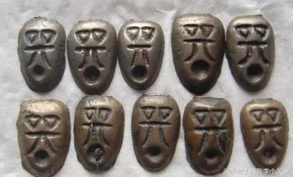 從字形上看,如果以文字的發展歷史看,在上古到戰國時期,文字更多的是像形字,也就是文字的形狀即代表著其內涵。如“咒”字,考慮到楚國向來推崇巫文化,楚國君主也多有君權神授的意思。那麼,這個“咒”字,就顯得頗為神秘,這個“咒”字蟻鼻錢,其形狀也特別有意思,像個人臉,也和上古時期發現的面具相似,如三星堆面具等,後來人們將蟻鼻錢稱為鬼臉錢,就是拜此“咒”字所賜。