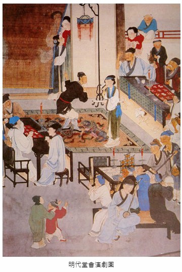 [山西洪洞明應王殿元雜劇壁畫1324年]畫面繪有演員和伴奏人員7男4女,共11人。前排左起第一人,身高173厘米,淨面無須,著藍色宮裝,長及地,胸前繡金龍三條,一腿露出靴尖,一腿半露紅邊長褲及黑靴,右手執一宮扇,左手撩衣;第2人,身高173 厘米,粗眉、絡腮鬍,張口微露齒,頭戴黑色帽,著中長黃底紅藍大花衣,袒胸,著黃色圓口鞋,雙手作表演狀,當為淨色;第3人居全場中心,身高178厘米,面目清秀,頭戴展翅襆頭,雙手執笏,紅袍及地,僅露腳尖,鞋黑色,兩耳有耳環孔,手指纖細修長,顯係女扮,當為忠都秀所扮演的正末色;第4人,身高173厘米,戴有髯口,穿淡青滾邊藍底紅花大袍,著薄底黑靴,雙手拱捧胸前,眼神注視左下方,作恭順聆聽狀,腰間右側橫插一卷黃色物件,當為外色;第5人,身高171厘米,淨面無髯,身著黃色圓領緊袖宮裝,衣長及地,袖長過手,兩肩及胸腹繡有四隻白鶴圖案的花紋,左手執大刀 ,右手掩於袖內,此人與左起第一人當為劇中紅袍主角的侍從。後排左起第1人,從幔後露出頭部,右耳有明顯的耳環孔,手指修長;第2人,短胡滿腮,著白衣,戴紅色圓形寬邊蒙古帽,身旁置一大形皮鼓,右手掌著鼓架,左手擊鼓;第3人,著黃色蒙古裝,頭戴蒙古圓形寬邊帽,左手食指和小指朝上放開,其餘手指按著笛孔,作吹笛狀;第4人,身高165厘米,著藍色衲衣,腰繫折裙,露出茶色薄底鞋,頭戴蒙古帽,濃眉滿須,似為淨角;第5人,身高145厘米,內著紅色衣服,緊袖,外罩黃色帔子及地,右腳著紅色鞋,露出腳尖,雙手捧一物執左胸前,似拍板,左耳有耳環孔,手指亦修長;第6人,身高149厘米,黑髮,右鬢插一朵白色小花,著黃色內衣,外披淡青色帔子,緊袖,兩手執宮扇,眼神注視左下方, 當為女侍。這11人組成的場面,是元雜劇正末、外、淨等腳色和鼓、笛、拍板等樂器伴奏者臨場演出時的寫照。這幅壁畫還反映了當時演劇所用的砌末(道具)是很講究的:有繡花的帷幕、幕上繪圖兩幅,右邊一圖繪蒼松為背景,畫一黑龍張牙舞爪,怒目而視;左邊一圖繪一壯士右手執劍,兩手張開作斬殺狀。舞台上方除懸有表明演齣戲班的橫額之外,還置有供給演員表演的朝笏、刀、扇之類的砌末,都經過美化加工,已非日常使用的實物。壁畫所繪舞台,是以方磚鋪地面,與現存元代舞台遺址的實況相符。
