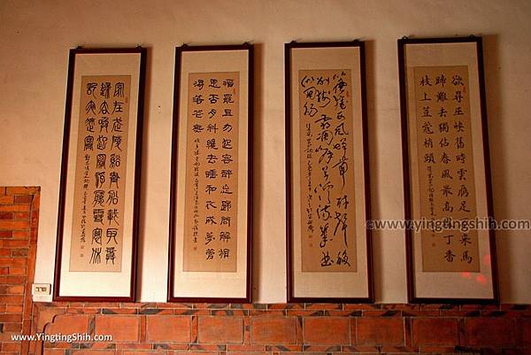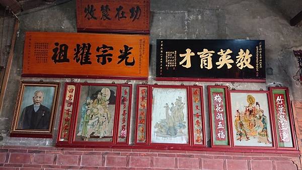 屋肚个裝置藝術有刺繡、字畫、玻璃彩畫、彩繪、木雕、磚刻這兜。刺繡、字畫主要在阿公婆牌兩片、頂高,掛等五幅个花鳥、字畫這兜「原汁原味」个藝術作品,非常个工夫、幼秀。這兜係起屋主人盛祥公个「大孫嫂」自家刺來做嫁妝帶過來个,係清朝陳秀才个孫女,寫字个人就係厥公陳秀才。還有一幅對聯刺等「貴自勤中得,富從儉中來」,落款「李遠樵書」,李遠樵係當時臺灣三大收藏家李錫金个孫仔。這對仔掛到祖公牌脣,用來時時勉勵子孫。(圖16)