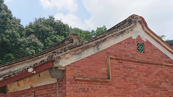 橫屋外牆有鳥踏,牆腳採用鵝卵石結造,毋單止有在地性,分人看着紅磚、花崗石板剛硬个建築,增添柔和个美感。棟頭採用「金、火」兩式,係起屋主人盛祥公從這間屋个五行來看,後背个化胎、屋脣个風圍都當闊,種當多樹仔,毋缺「木」;四管水透落六分地个半月池大陂塘,講係「細水長流、四方納財」,毋缺「水」;起屋之時,田地就有百過甲吔,毋缺「土」。故所,為着屋場環境所缺个需要,就在棟頭做「金、火」兩式來補足五行。(圖15)