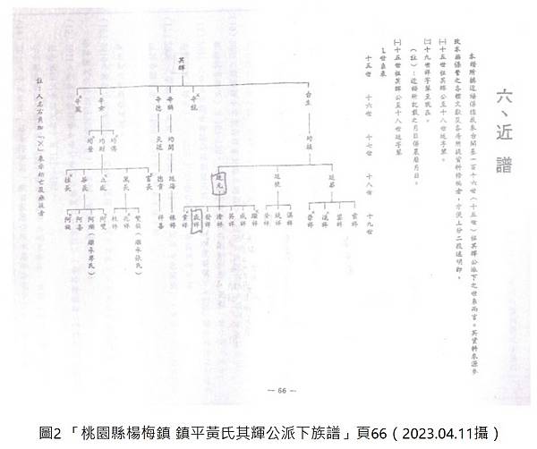 圖2 「桃園縣楊梅鎮 鎮平黃氏其輝公派下族譜」頁66(2023.04.11攝)