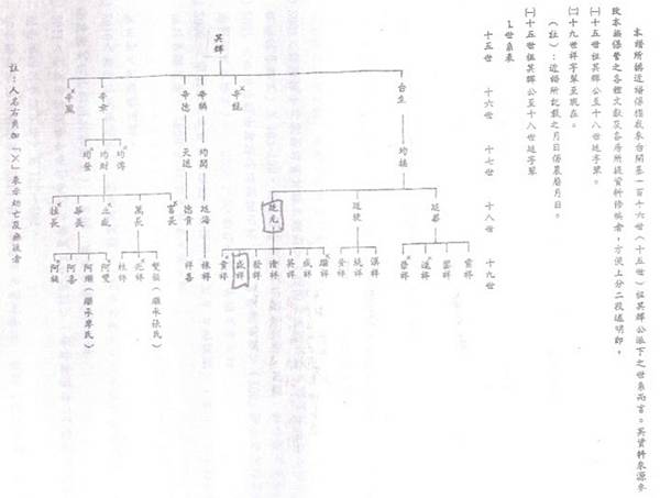 台生公發現這搭地毋好,放忒贌租,改租林本源个土地,到42歲還係異苦,毋過當𢯭眾,到今錫福宮還有捐財物起廟个記錄。佢身體當砸,所有个田溝、陂塘、田駁,全部自家來。賺兜仔錢咧,到下析買地來耕。做人講義氣,慢慢仔開始做人頭,家族个地位漸漸仔建立起來,正有成果。厥爸其輝公在諸羅一搭仔毋好生活,背尾其輝公也帶等餔娘子女來楊梅壢偎凴台生公,故所族譜寫「其輝公派下」。(圖2)16世台生公在乾隆20(1755)年出世,道光6(1826)年72歲過身,恁樣看來,黃屋來楊梅第一代就打下基業。