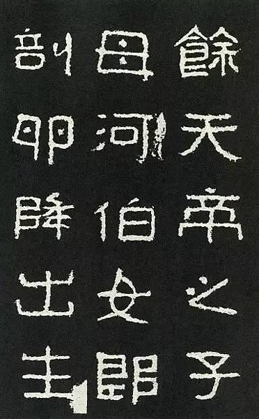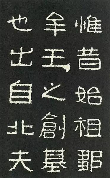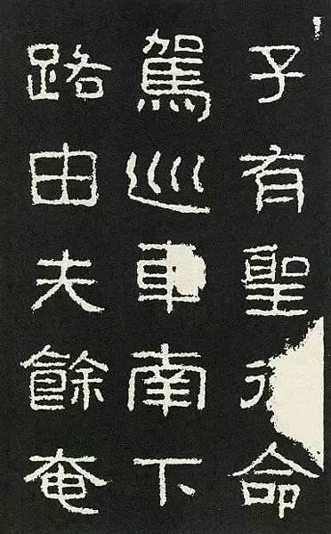 《好大王碑》中豎的基本形態較少,故只能從其長短參差、直斜取勢和收尼變化上做文章。如圖六「昔」、「卵」、「南」、「其」等字中豎畫的組合,有的一豎直立,另一豎上端或下端略作傾斜;有的一豎較長,則另』—豎較短。故此碑的豎畫雖多用篆書筆法,但結體時卻仍多是隸書的情趣。