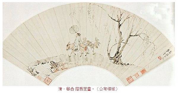 團扇畫幅比較小,畫法亦十分細膩,這種在團扇上畫畫的雅習,開啟了中國小品繪畫的先河。如趙伯驌的《風檐展卷》,描寫士大夫優雅清閒的生活形態,畫中還畫有端茶的茶童,畫旁還有清高宗乾隆的題字:「常言開卷胥有益,其益公私亦自殊。不識風簷沉思者,心於為己為人乎。」題得好,小得好,精緻之極。