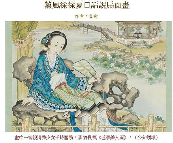 畫中一容貌清秀少女手持團扇。清 許良標《芭蕉美人圖》。
