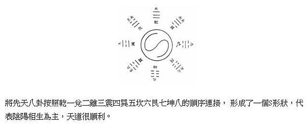 將先天八卦按照乾一兌二離三震四巽五坎六艮七坤八的順序連接, 形成了一個S形狀,代表陰陽相生為主,天道很順利。