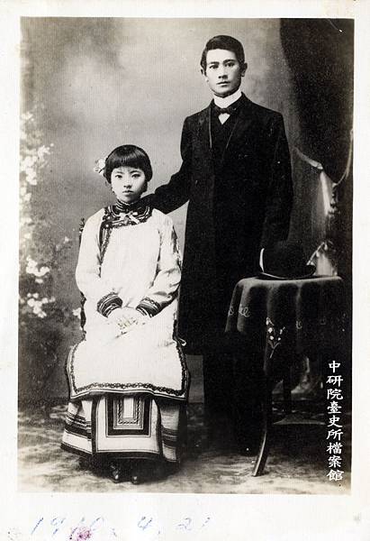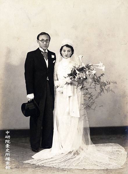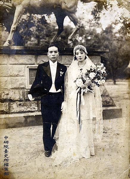 1911年,高再祝與高許美的結婚週年紀念照片(圖3左)中,高再祝依舊身著福鏤庫禮服搭配黑色皮鞋,高許美則從臺灣衫改穿改良式禮服,頭戴白紗、手持百合捧花。此外,再從1920年代,霧峰林家林烈堂的長子林垂拱,與前清進士陳望曾之女陳瓊珍的結婚照(圖3右)來看。林垂拱並未穿著時髦的西裝,而穿著中國傳統的長袍,陳瓊珍也並未穿著完全西式的長裙擺禮服,卻是以短版的鳳仙裝搭配長度及地的白色頭紗,且穿著有刺繡圖案的布質高跟鞋。藉由過渡時期的兩張老照片,看出臺灣當時已將一般喜事視為禁忌的白紗,轉化成為聖潔的象徵,而西方婚禮服飾也逐漸傳入臺灣社會。 https://bit.ly/2WsYOug