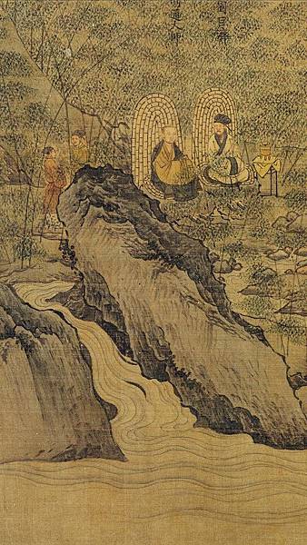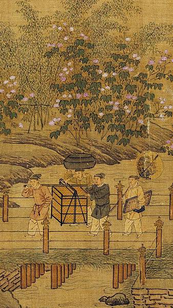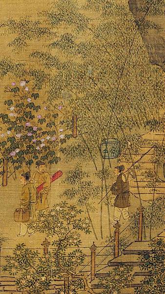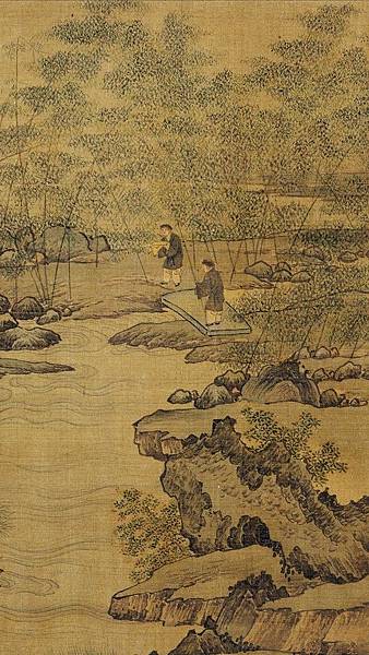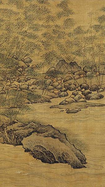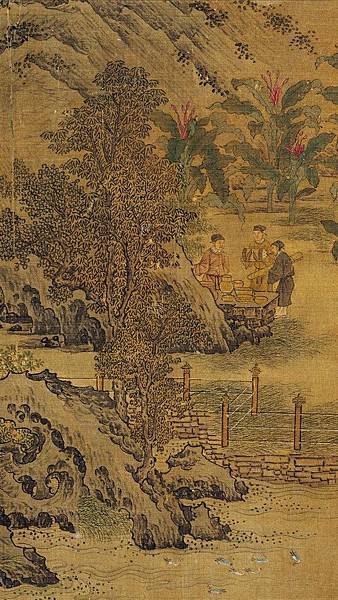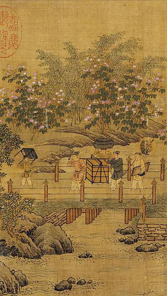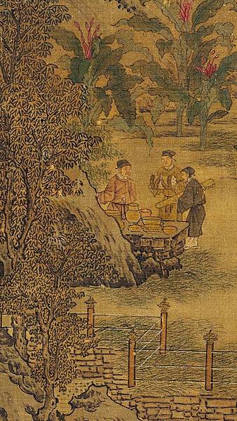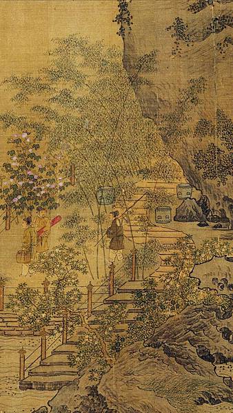 劉松年(約1155—1218),南宋畫家,錢塘(今浙江杭州)人,淳熙間畫院學生,紹熙間升畫院待詔。寧宗(1195—1224)時進《耕織圖》被朝廷看重,賜金帶,為「南宋四大家」之一。工山水、人物、界畫,師承李唐,畫風筆精墨妙,清麗嚴謹,設色典雅,界畫工緻。常畫西湖,多寫茂林修竹、山明水秀之西湖勝景。因擁護抗金,反對投降,曾苦心孤詣畫《便橋圖》,希望效法唐太宗戰勝強敵突厥。傳世代表作《四景山水圖》卷及《天女獻花圖》卷,現藏故宮博物院;開禧三年(1207)作《羅漢圖》軸和嘉定三年(1210)作《醉僧圖》軸等,現藏台北故宮博物院;《雪山行旅圖》軸,藏四川省博物館;《中興四將圖》卷傳為其所作,藏中國國家博物館。