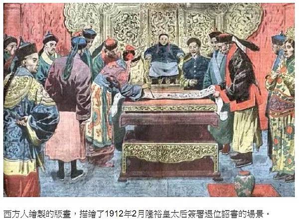 西方人繪製的版畫,描繪了1912年2月隆裕皇太后簽署退位詔書的場景。