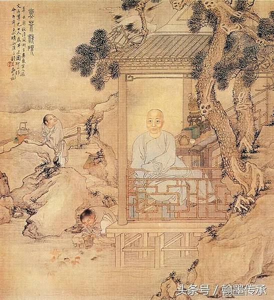 此畫在兩株虬曲的松樹下,有傍石而建的水榭,一中年男子倚欄而坐。榭內琴桌上置有茶具、書函,一侍童在水邊滌硯,數條金魚正游向硯前;另一侍童拿著蒲扇,對小爐扇風烹茶。人物線條尖細挺勁,轉折硬健,師法陳洪綬而不受所囿,其技法已臻純熟,儀容閒雅,設色清淡,為清末海上畫派的風格。這是同治十年(1871),作者三十九歲時,為友人文舟所作的肖像畫