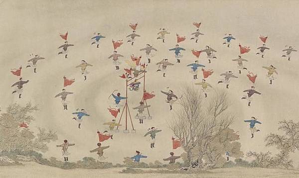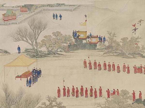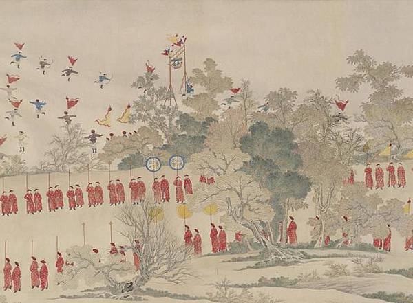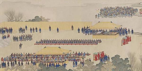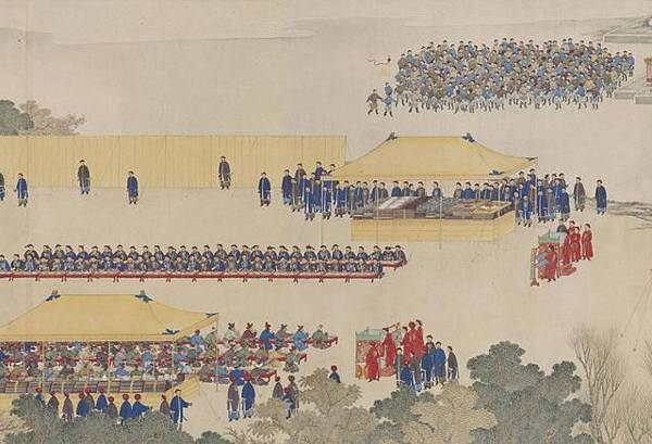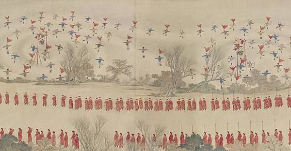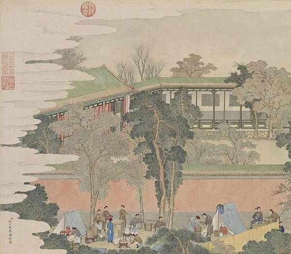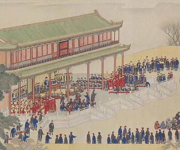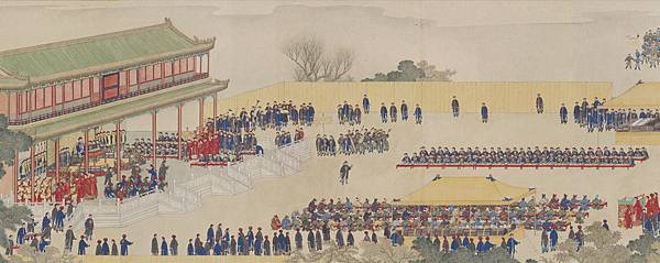 乾隆二十五年(1761年),紫光阁修缮完成,乾隆下旨将平定准部、回部的100名功臣画像张悬于四壁。次年正月,乾隆皇帝又在此设庆功宴,王公贵族、文武大臣、蒙古族首领以及西征将士百余人出席。此幅描绘了当时宴庆的宏大场面。图中建筑借助西洋绘画手法而沿用中国画传统的手卷形式来表现。位于中南海内的紫光阁始建于明代,到清代成为皇帝阅射和殿试武举之所,乾隆时重修,至今依然保持着当年盛世的形貌,图画中之建筑与紫光阁实景两相对照,饶有情趣。 https://bit.ly/2MdrN1u