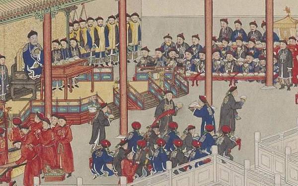 清乾隆二十五年(公元1761年),紫光閣修繕完成,乾隆下旨將平定準部、回部的100名功臣畫像張懸於四壁。次年正月,乾隆皇帝又在此設慶功宴,王公貴族、文武大臣、蒙古族首領以及西征將士百餘人出席。此卷描繪了乾隆帝設慶功宴的宏大場面。