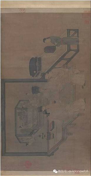 此圖是絹本設色,縱40.3厘米,橫70.5厘米,故宮博物院藏宋人摹本。