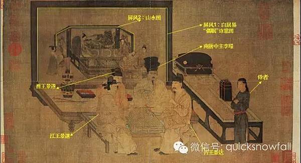 畫家畫下這個場面不僅僅是表現出畫中人物的長幼順序,而且也是隱喻李璟的幾個兄弟們都接受李璟頒布的“兄終弟及製”這個規矩。