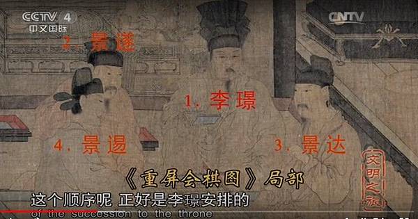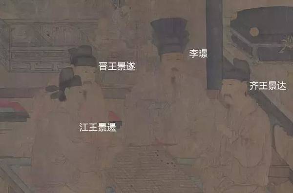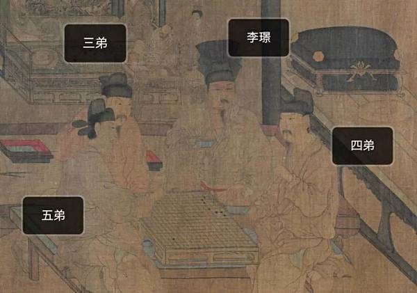畫中,李璟和他的三個兄弟正坐在一起下棋,那個帽子和其他三位都不一樣的就是李璟了,與他坐在同排的是他的三弟(晉王李景遂) ,李煜正對著的是他的四弟(齊王李景達) ,和四弟正在棋藝切磋的是五弟(江王李景逿) 。