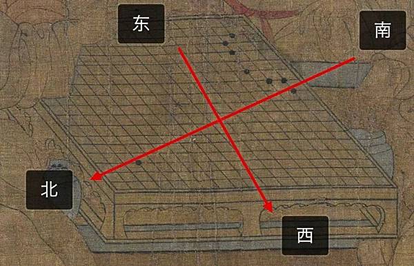 小四更覺得有意思的是畫中的棋局,畫中的棋盤中沒有一枚白子,只有八枚黑子,稍微對為期有所了解的朋友都知道這樣的棋局是根本不存在的(就是用圍棋玩五子棋也不會出現)。執黑的景逿用一個黑子來占樁,用另外七個黑子在棋盤的最高處擺出了一個勺狀組合,像極了北斗七星。而七星正對著中主李璟。這個細節不可能是周文矩隨意畫上去的,我想一定是朝廷的囑託。