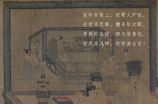 第一幅畫自然是四人會棋,那麼第二幅、第三幅呢?請將目光移向後面的屏風:屏風上描繪的是一個慵懶的漢子躺在榻上,旁邊妻子在侍奉他的場景。這幅「畫中畫」是白居易詩作《偶眠》的意境: