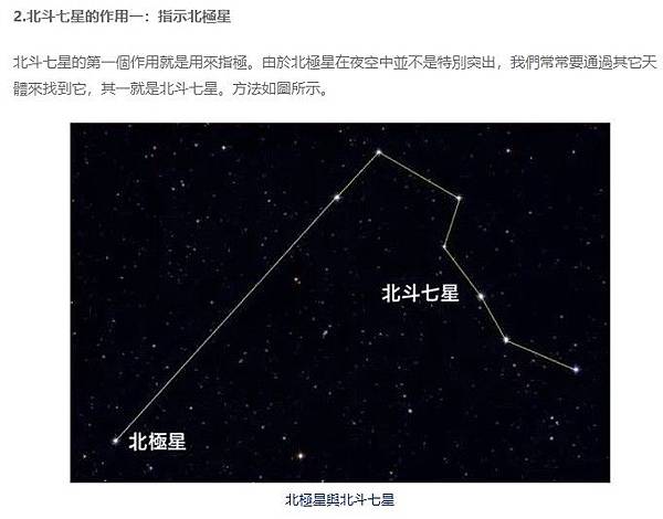 其中前面的四顆組成了斗勺,所以稱它們為斗魁,而後面的三顆星像是斗勺的柄,所以又稱斗柄。北斗七星可以幫助我們判別方向。將北斗七星中的天樞和天璇聯起來,再從天璇到天樞延長五倍遠,就是北極星。找到北極星,你在任何地方都不會迷失方向了。
