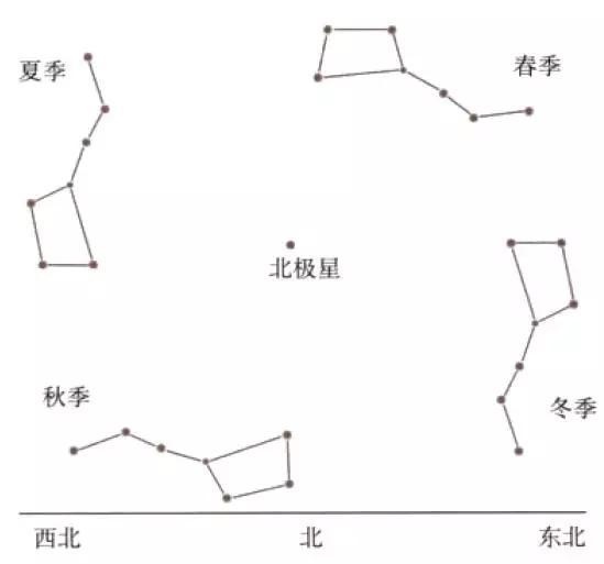 北斗七星在天空中的位置與季節之間還存在着有趣的關係,我國古代勞動人民發現:「斗柄東指,天下皆春;斗柄南指,天下皆夏;斗柄西指,天下皆秋;斗柄北指,天下皆冬」。這裏說的都是黃昏時斗柄的指向。