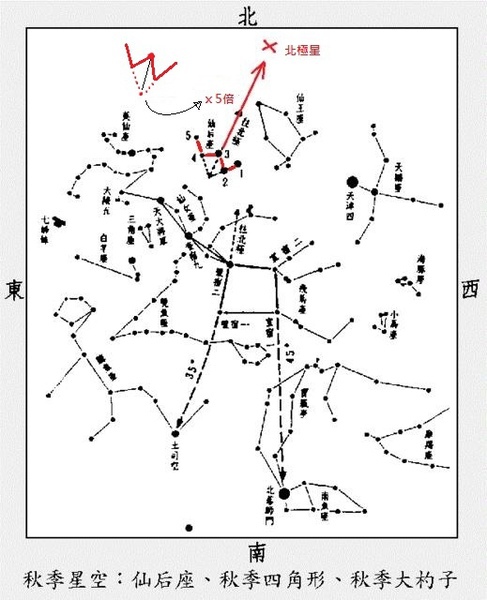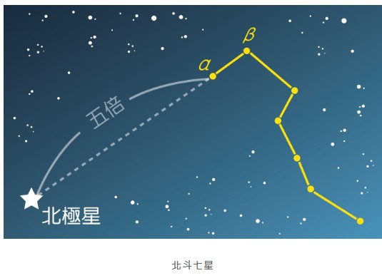 將北斗七星的天樞與天璇連線,由天璇向天樞的方向延伸約5倍的距離,就可以找到北極星。