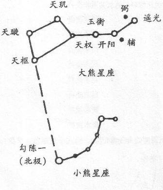 七顆星和我們的距離並不相等,它們在天球上的投影才構成了這個斗勺的形狀。它們的中文名字分別是天樞、天璇、天璣、天權、玉衡、開陽和搖光。道教稱北斗七星為七元解厄星君,居北斗七宮,即:天樞宮貪狼星君、天璇宮巨門星君、天璣宮祿存星君、天權宮文曲星君、玉衡宮廉貞星君、開陽宮武曲星君、搖光宮破軍星君。《淮南子•天文訓》說:「帝張四維,運之以斗,月徙一辰,復反其所。正月指寅,十二月指丑,一歲而匝,終而復始。」可見西漢初年已經將北斗定季節的方法,發展到以斗柄指向寅卯等十二方位,確定正月、二月等十二個月了。《史記•天官書》說:「斗為帝車,運於中央,臨制四鄉。分陰陽,建四時,均五行,移節度,定諸紀,皆繫於斗。」言天帝坐在由北斗組成的馬車上巡行四方,行一周就是一年,並由此區分出一年中的陰陽兩個半年,分判出四季和五個時節,節氣和太陽的行度也由此可以確定。由此可知,人們利用觀測北斗星的方位,對於確定農時曆法有着十分重要的意義。這便是為什麼古人那麼重視北斗星的原因。《晉書·天文志》說北斗七星在太微北,樞為天、璇為地、璣為人、權為時、衡為音、開陽為律、搖光為星。天樞是七星樞紐的意思、天璇指掌管旋轉的美玉、天璣是閃耀的珍珠、天權掌管權衡、玉衡是平衡輕重、開陽是開陽氣、搖光是搖動不定的光芒。