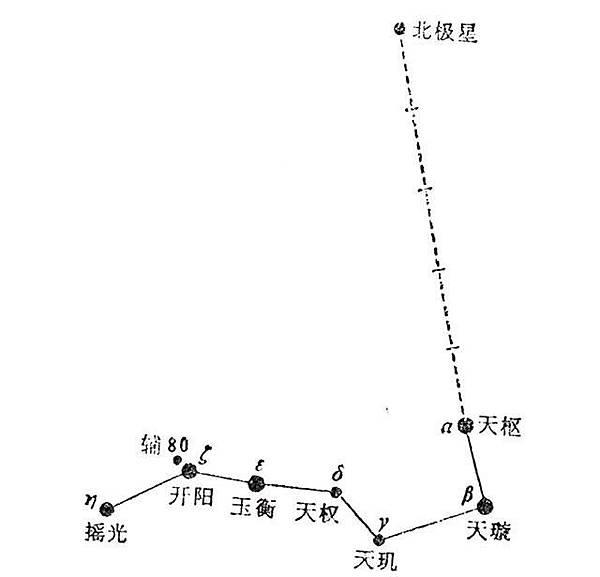 斗,在中國古代是舀酒的杓子。從杓子口到杓柄,七顆星分別為