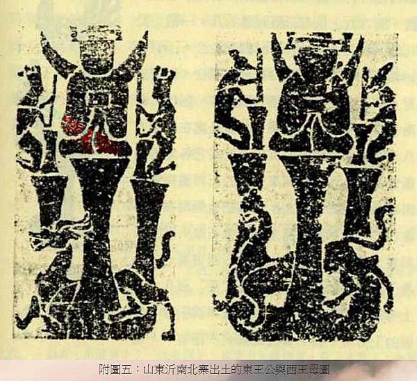 東王公左右侍者為雞首人身像和馬首人身像。東王公的特殊冠式山形冠和它肩頭的雙鳥與兩側的龍,是作為神性象徵出現的。