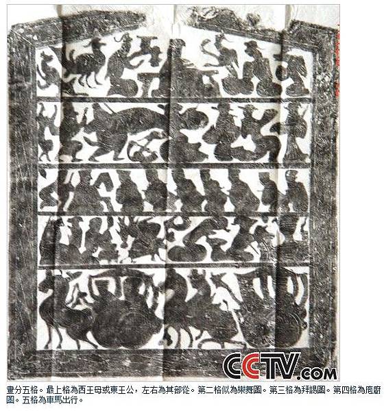 上層為東王公,東王公和西王母是漢世仙人世界的至尊,其旁常見九尾狐、玉兔、三足烏和其它神禽異獸。中層是孔子的弟子,其中頭戴雞冠的是子路,孔子及弟子像象徵著墓主對儒家思想的服膺。下層為車馬圖,這些車馬有時象徵墓主出巡,有時也用來表示出喪的行列。