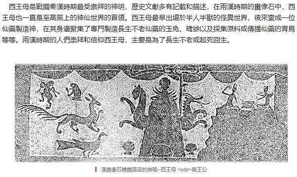 西王母是戰國秦漢時期最受崇拜的神明,歷史文獻多有記載和描述,在兩漢時期的畫像石中,西王母也一直是至高無上的神仙世界的首領。西王母最早出場於半人半獸的怪異世界,後來變成一位仙藥製造神,在其身邊聚集了專門製造長生不老仙藥的玉兔、蟾蜍以及採集原料或傳播仙藥的青鳥等等。兩漢時期的人們崇拜和信仰西王母,主要是為了長生不老或起死回生。