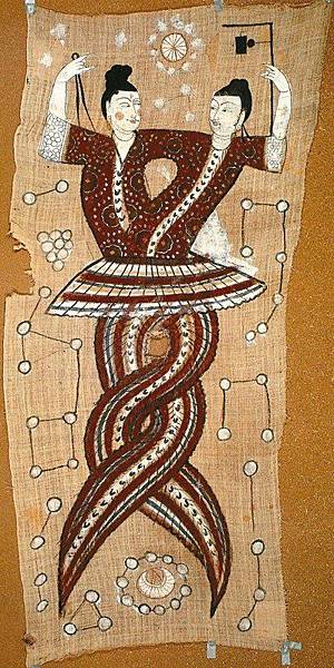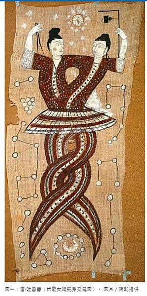 中國上古的創世紀大神「伏羲」、「女媧」,都有蛇的身體,從漢代畫像石到唐代吐魯番出土的帛畫,人頭蛇身,雌雄交尾,人類的身體借祖靈強大神祕的蛇身繁衍子嗣。(圖一)