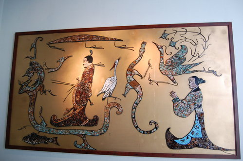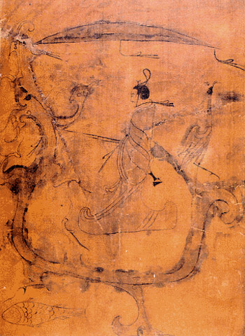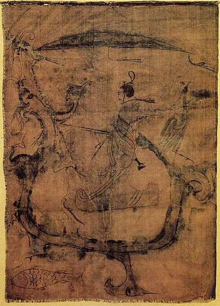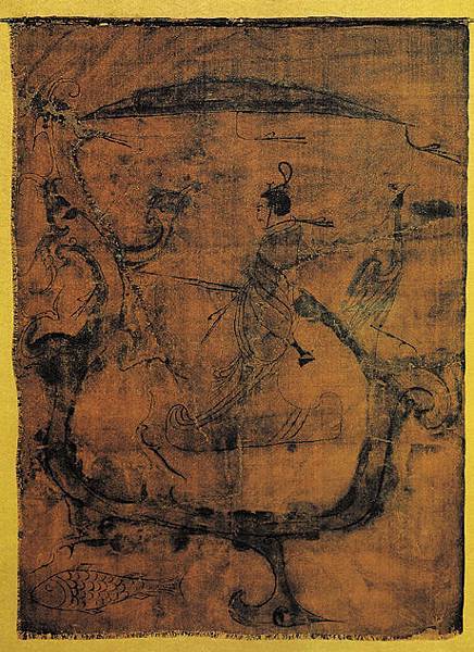 《人物御龍圖》1973年在湖南省長沙市子彈庫一號墓出土,也屬於葬儀中引導墓主人升天這一類祈禱性作品,畫中部分還偶用了金白粉彩,它為我們了解那些金碧輝煌的楚國壁畫提供了一定的實證。這幅帛畫是迄今發現最早使用金的粉彩的作品,人物用流暢的線條勾描,再施以平塗和渲染,畫中龍、鷺、輿蓋基本用白描勾勒,表現出繪者純熟的繪畫技藝和對狀物的精心細緻的觀察。帛畫細絹質地,高37.5厘米,寬28厘米,帛畫上端縫裹細竹篾,並系絲繩,其用途無疑是葬儀用的旌幡。