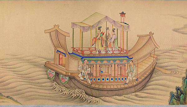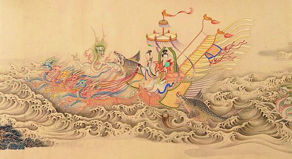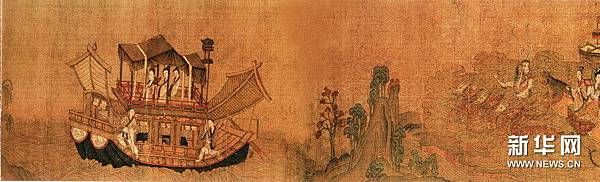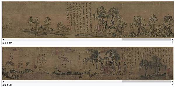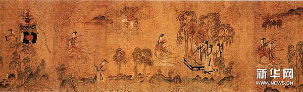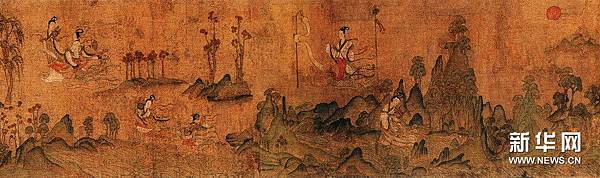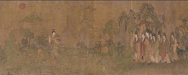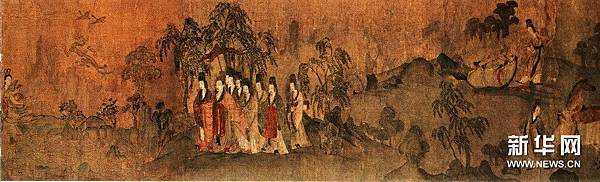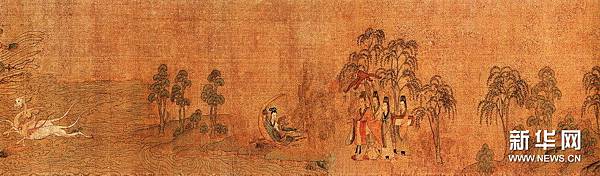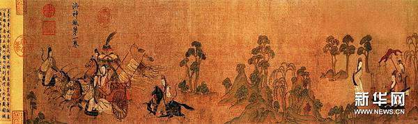 【顧愷之洛神賦圖卷(宋摹)】 《洛神賦圖》卷,晉,顧愷之(宋摹),絹本,設色,縱27.1厘米,橫572.8厘米。 此圖是根據三國(220--265年)魏人曹植所寫《洛神賦》而創作的故事畫。畫面開首描繪曹植在洛水河邊與洛水女神瞬間相逢的情景,曹植步履趨前,遠望龍鴻飛舞,一位“肩若削成,腰如約素”、“雲髻峨峨,修眉聯娟”的洛水女神飄飄而來,而又時隱時現,忽往忽來。後段畫洛神駕六龍雲車離去,玉鸞、文魚、鯨鯢等相伴左右,洛神回首張望,依依不捨,一種無奈離析之情顯現畫面。 此圖分段描繪賦的內容,構圖連貫,主要人物隨著賦意,反復出現。設色濃艷,畫法古拙,山石樹木鉤填無皴,“列植之狀,則若伸臂布指”,所謂“人大於山,水不容泛”,系初唐以前畫風。引首有清高宗弘曆行書“妙入毫巔”。卷後有元趙孟頫行書《洛神賦》、李衎、虞集、明沈度、吳寬詩跋均偽。又乾隆詩題。鈐“明昌”、“禦府寶繪”、“群玉中秘”、“明昌禦鑒”及清內府乾隆、嘉慶、宣統諸藏印。 此圖不書《洛神賦》文,亦無名款,從畫法、絹、色等方面研究,當為宋人摹本,但畫風仍存六朝遺韻,其原本傳為顧愷之所作。 《石渠寶笈·初編》、《石渠隨筆》著錄。 https://is.gd/oIc0El