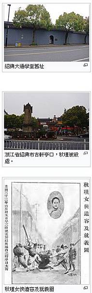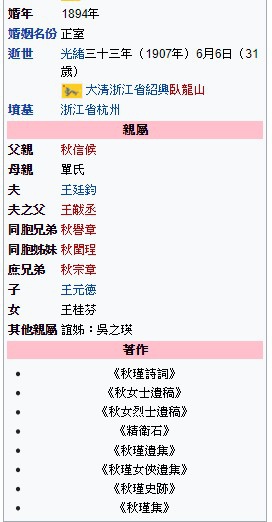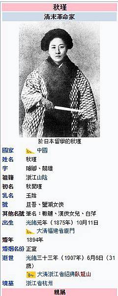 秋瑾(1875年11月8日-1907年7月15日),浙江省紹興府山陰縣(今紹興市)人,生於福建省廈門。初名閨瑾,乳名玉姑,字璿卿,號旦吾,留學日本後改名瑾,字(或作別號)競雄,自稱鑑湖女俠,筆名鞦韆、漢俠女兒,曾用筆名白萍。近代女權運動家、革命志士,最後被清廷抓捕處決,而她的死間接促成辛亥革命。