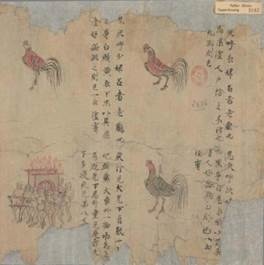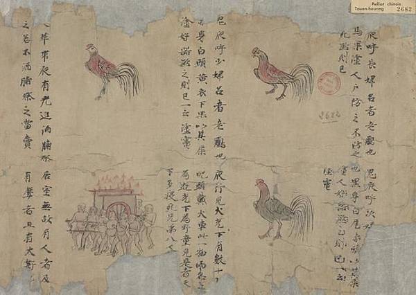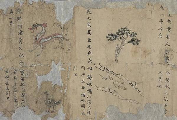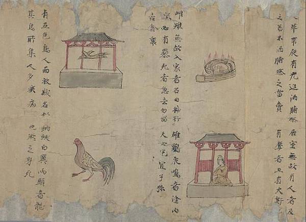 其次,用圖象,也即本文所謂的鬼神畫。前文已經引到《抱朴子》中說「論百鬼錄,知天下鬼之名字,及〈白澤圖〉、《九鼎記》,則眾鬼自卻」。關於《九鼎記》我們所知甚少,〈白澤圖〉則不但清代以來就有學者從唐宋及流傳日本的典籍中輯出佚文,[74]也還有敦煌遺書中發現的〈白澤精怪圖〉殘卷(P2682、S6261)。[75]《抱朴子.極言》「昔黃帝生而能言,役使百靈,可謂天授自然之體者也,猶複不能端坐而得道。故陟王屋而受丹經……窮神奸則記白澤之辭……。」沈約在《宋書.祥瑞志》又有更詳細的說明:「澤獸:黃帝時巡狩至於東濱,澤獸出,能言,達知萬物之情,以戒於民,為時出害。」《玉函山房輯佚書》卷七七由唐代《開元占經》卷一一六引六朝孫柔之〈瑞應圖〉「白澤」條「黃帝巡於東海,白澤出,能言語,達知萬物之情,以戒於民,為除災害」。這一段文字也見於宋張君房輯《雲笈七籤》卷一○○《軒轅本紀》引︰「帝巡狩,東至海,登桓山,於海濱得白澤神獸,能言,達於萬物之情,因何天下神鬼之事,自古精氣為物、游魂為變者凡萬一千五百二十種,白澤能言之,帝令以圖寫之,以示天下。」[76]夏德安在敦煌找到一幅關於描繪「白澤能言之,帝令以圖寫之」的繪畫(彩圖1、圖5,倫敦,大英博物館藏)。從敦煌發現的九到十世紀的材料來看出,白澤的驅鬼除邪的功能和鍾馗及其鍾馗畫是聯繫在一起的,而且在唐宋以後的歷史發展中前者逐漸為後者所取代。[77]