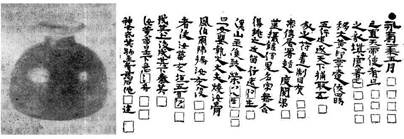 我們要討論的第三種與劾鬼術有關的考古材料,是一九八○年在洛陽東郊史家灣村發現的永壽二年(156)朱書陶瓶鎮墓文。[46]出土陶瓶口徑九點一,底徑二三點五,通高二四點四公分,放在墓門口的東南角,瓶内裝有大量綠豆般大小的藥丸。瓶腹部豎寫朱書文字十六行,每行九到十字,最後一字都寫到瓶底下,因此殘損嚴重(圖2)。全文如下: