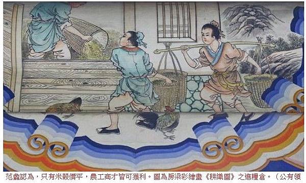 范蠡認為,只有米穀價平,農工商才皆可獲利。圖為房梁彩繪畫《耕織圖》之進糧倉。(公有領域)