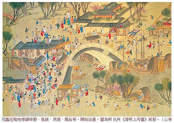 范蠡在陶地根據時節、氣候、民情、風俗等,開始治產。圖為明 仇英《清明上河圖》局部。(公有領域)