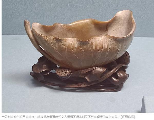一只刻意染色的玉荷葉杯,就被認為傳達宋代文人惆悵不得志卻又不放棄理想的象徵意義。(江昭倫攝)