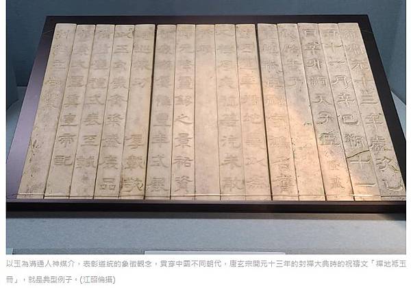 以玉為溝通人神媒介,表彰道統的象徵觀念,貫穿中國不同朝代,唐玄宗開元十三年的封禪大典時的祝禱文「禪地祗玉冊」,就是典型例子。(江昭倫攝)