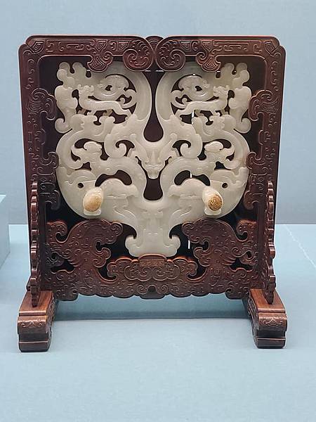 乾隆自己則因為愛好賞玩古玉,因此也提倡仿製古玉。故宮院藏一件「白玉群獸插屏」,有祥雲、有瑞獸、有神樹,明顯漢玉制式,正是乾隆仿古玉的代表,而實際上它是一個銅鏡台座,白玉本體下方左右突起的圓雕鳥雀造型,則是為了放置銅鏡之用,鳥雀局部還刻意染成棕褐色,以示其羽毛,呈現靈動感;看不見的木座背後,還設計了夾層,目的是為了收納銅鏡,可說巧思處處。