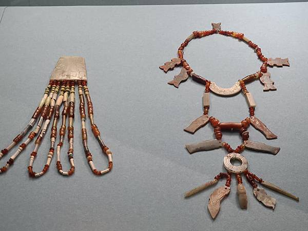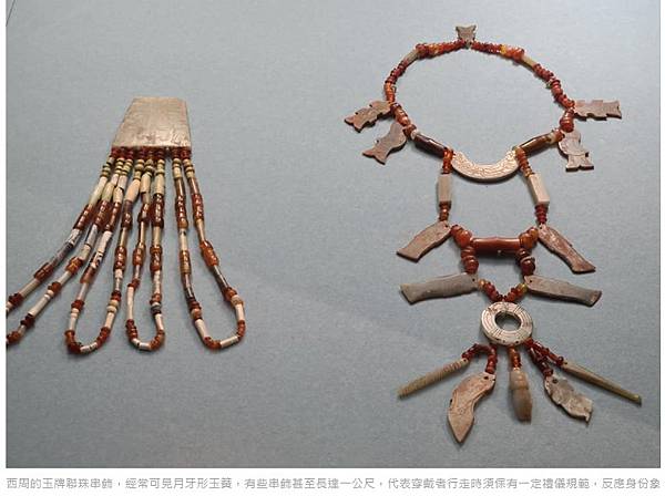 西周的玉牌聯珠串飾,經常可見月牙形玉簧,有些串飾甚至長達一公尺,代表穿戴者行走時須保有一定禮儀規範,反應身份象徵。(江昭倫攝)