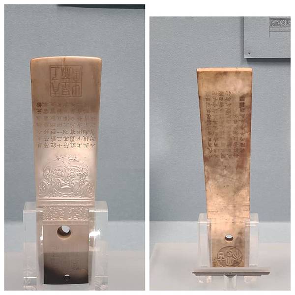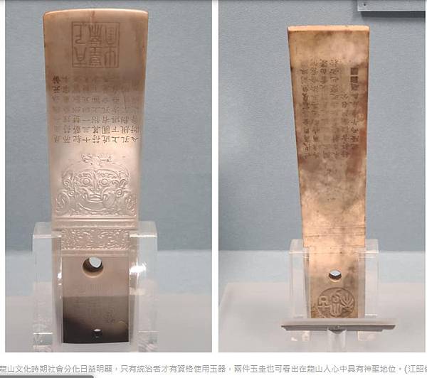 龍山時期的兩件玉圭,為文化部指定國寶,源自斧的造型,由於上頭有獸面紋、鷹鳥紋等紋樣,代表在當時龍山人心目中具有神聖地位。
